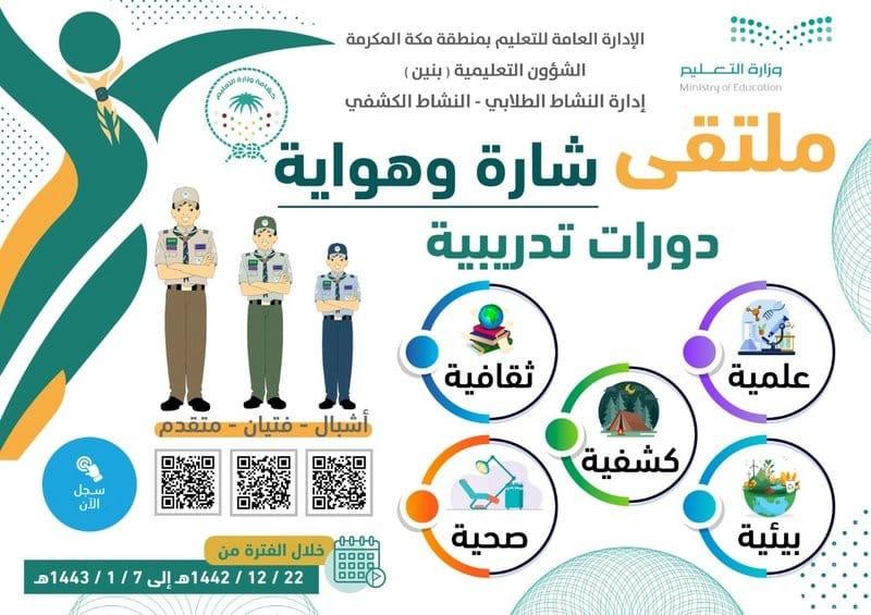 نظم النشاط الطلابي بتعليم مكة المكرمة دورة تدريبية في مجالات متنوعة ضمن فعاليات ملتقى "شارة وهواية" والذي يستمر حتى السابع من شهر محرم، حيث يستهدف كشافة تعليم مكة المكرمة، وتقام الفعاليات عن بعد عبر برنامج الزووم.
