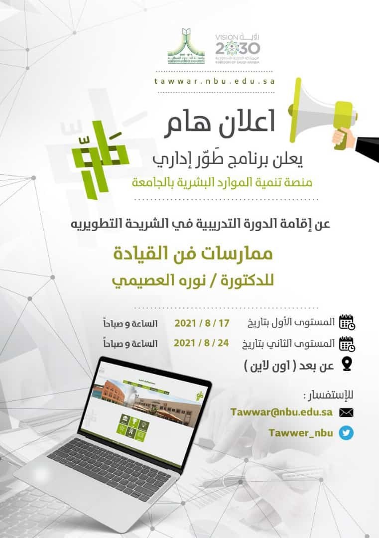 يقيم برنامج طور إداري بجامعة الحدود الشمالية دورة ممارسات فن القيادة للدكتورة نورة العصيمي  ، وكم يأتي المستوى الأول بتاريخ 202‪1/8/17