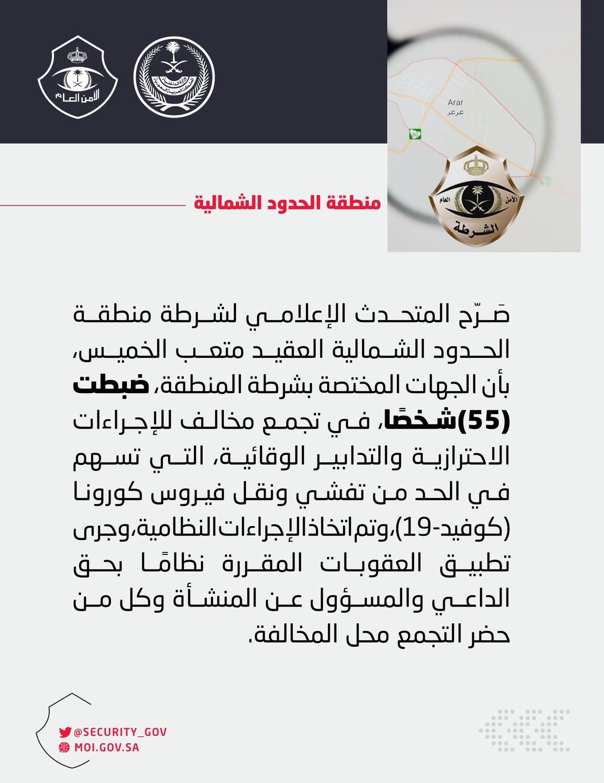 صَرّح المتحدث الإعلامي لشرطة منطقة الحدود الشمالية العقيد متعب الخميس، بأن الجهات المختصة في شرطة المنطقة، ضبطت (55) شخصًا، في تجمع مخالف للإجراءات الاحترازية والتدابير الوقائية، التي تسهم في الحد من تفشي ونقل فيروس كورونا (كوفيد – 19)، واتخذت الإجراءات النظامية، وجرى تطبيق العقوبات المقررة نظامًا بحق الداعي والمسؤول عن المنشأة وكل من حضر التجمع محل المخالفة.