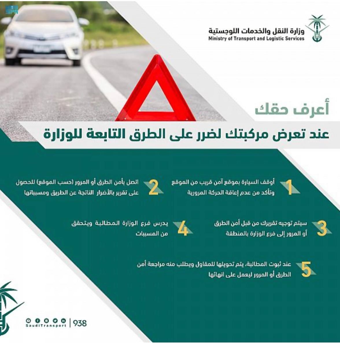 حددت وزارة النقل والخدمات اللوجستية، 5 خطوات لطريقة الاعتراض في حال تعرض المركبة للضرر على الطرق التابعة لها.