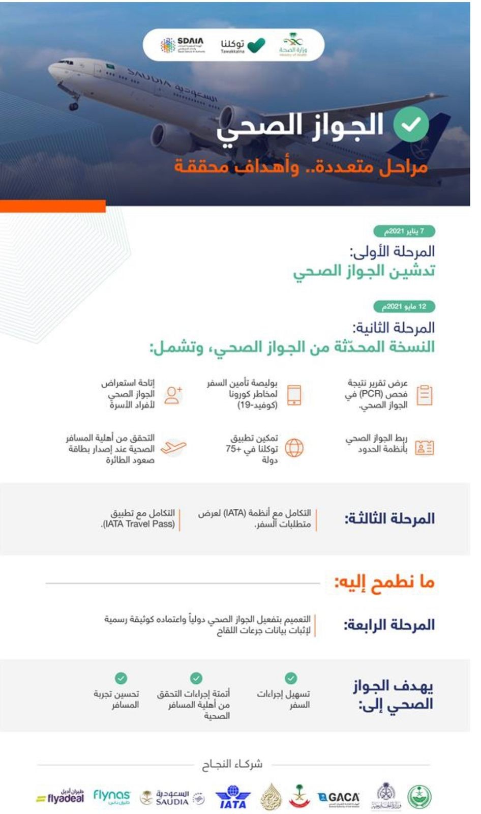 وتتضمن المرحلة الثالثة التكامل مع أنظمة اتحاد النقل الجوي الدولي “أياتا”، لعرض متطلبات السفر، إضافة إلى التكامل مع تطبيق “iata travel pass”.