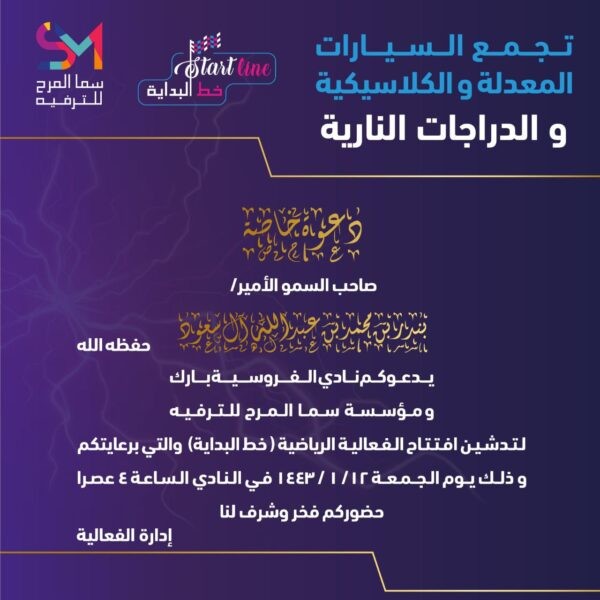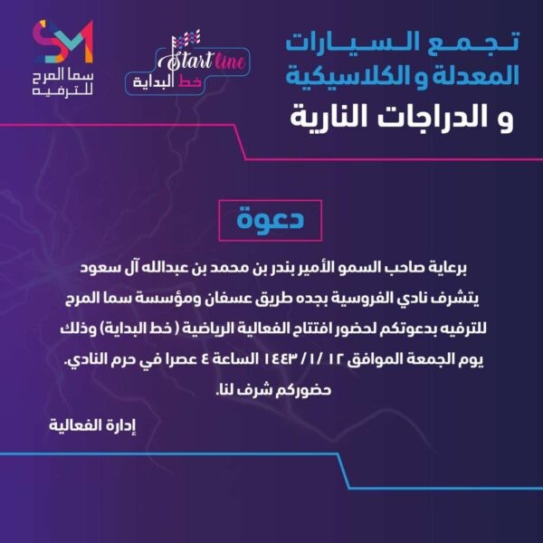 برعاية وتشريف صاحب السمو الأمير بندر بن محمد بن عبدالله آل سعود تدشن نادي الفروسية بجدة طريق عسفان ومؤسسة سما المرح للترفيه إفتتاح الفعالية الرياضية ( خط البداية ) ، وتجمع السيارات الكلاسيكية والمعدلة والدراجات النارية.