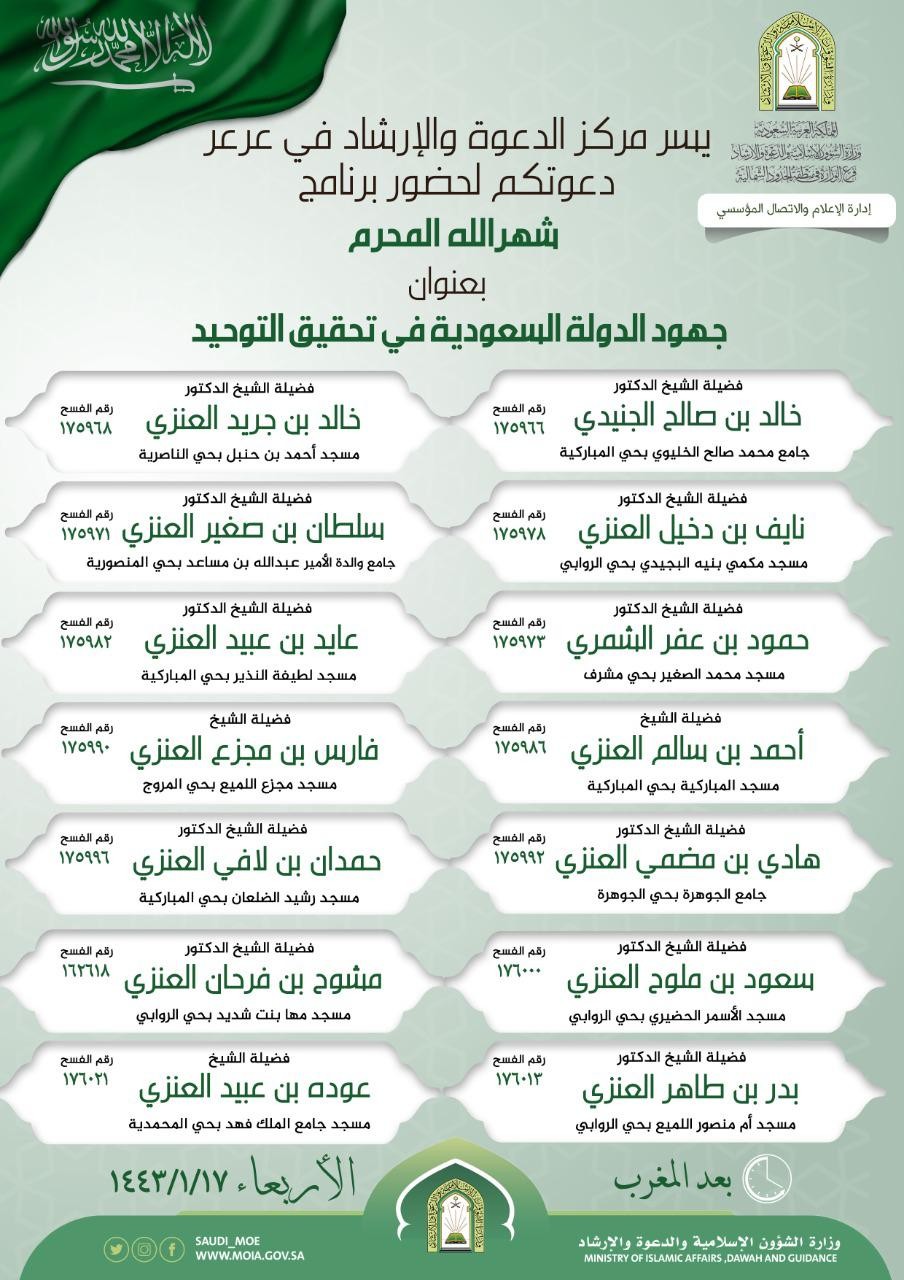 ينفذ فرع وزارة الشؤون الإسلامية والدعوة والإرشاد في منطقة الحدود الشمالية البرنامج الدعوي عن " شهر الله المحرم" بعنوان "جهود الدولة السعودية في تحقيق التوحيد"، عبر 14كلمة دعوية تقام جميعها الأربعاء الموافق1443/1/17هـ