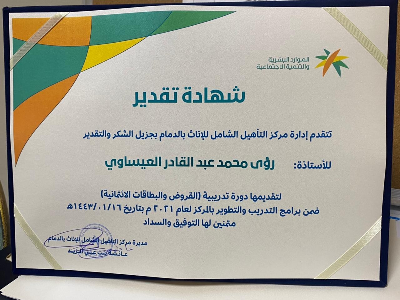 نظم مركز التأهيل الشامل للإناث بالدمام مساء أمس الثلاثاء دورة تدريبية بعنوان "القروض والبطاقات الائتمانية"، قدمتها "رؤى العيساوي" وذلك عبر البث الالكتروني (منصة Zoom)، تحت إشراف مديرة المركز "عائشة المزيد.