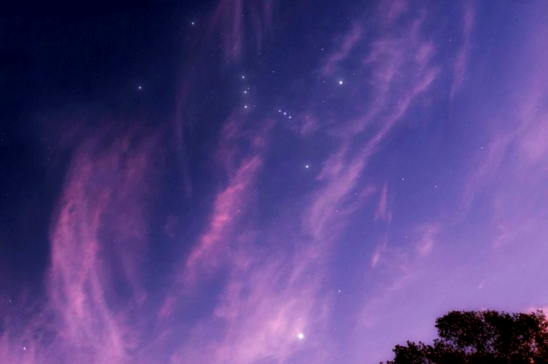 وأضاف: تشرق نجوم الجوزاء قبل الفجر في هذا الوقت من العام، ويمكن التعرف عليها من خلال ثلاثة نجوم تصنع خطًّا مستقيمًا قصيرًا تشكّل حزام الجوزاء، إلى جانب ذلك يوجد أسفلها نجم براق جدًّا يتلألأ بجنون في هذا الوقت من السنة هو نجم الشعرى، والذي يسمى أحيانًا نجم الكلب؛ لأنه جزء من نجوم الكلب الأكبر وبراق جدًّا عندما يكون منخفضًا في السماء، ويضيء بومضات حمراء وزرقاء يمكن رؤيتها بالعين المجردة.