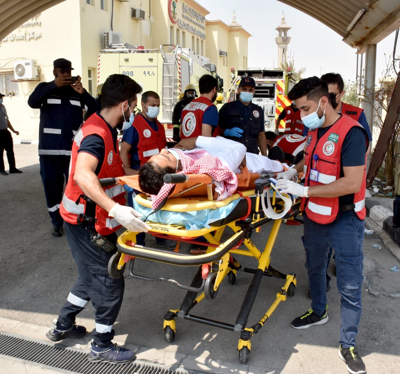 وشارك في الفرضية الدفاع المدني والشرطة والمرور وشركة الكهرباء السعودية وشركة المياه الوطنية وبإشراف من سعادة مدير عام فرع الهيئة بالمنطقة الشرقية الدكتور خالد بن راضي العنزي ومساعده للشؤون الإسعافية وعدد من القيادات الميدانية بالهيئة.