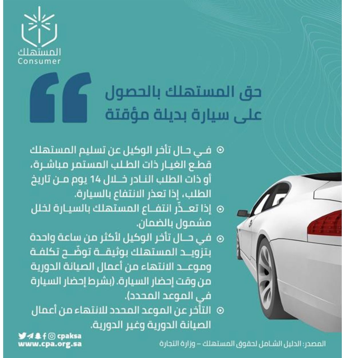 وقالت الجمعية إن الوكيل ملزم بتوفير سيارة بديلة بشكل مؤقت، في حال تأخره عن تسليم المستهلك قطع الغيار ذات الطلب المستمر مباشرة، أو ذات الطلب النادر خلال 14 يوماً من تاريخ الطلب، إذا تعذر انتفاع المستهلك بالسيارة لخلل مشمول بالضمان.