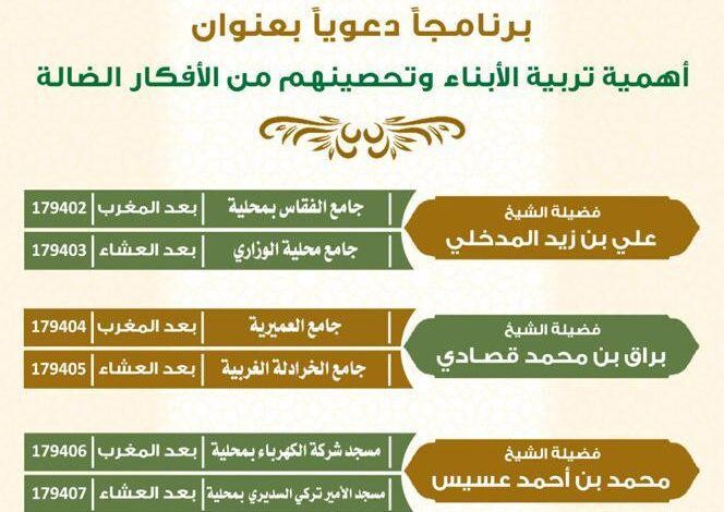 تنظم وزارة الشؤون الإسلامية والدعوة والإرشاد ممثلة بفرعها في منطقة جازان برنامجاً دعوياً بعنوان ” أهمية تربية الأبناء وتحصينهم من الأفكار الضالة ” مساء السبت الموافق 27 / 1 / 1443 هـ ، هذا وسيتحدث فضيلة الشيخ علي بن زيد المدخلي بجامعي الفقاس بمحلية وجامع محلية الوزاري وفضيلة الشيخ براق بن محمد قصادي بجامعي العميرية وجامع الخرادلة الغربية وفضيلة الشيخ محمد بن أحمد عسيس بِمَسجدي شركة الكهرباء بمحلية ومسجد الأمير تركي السديري بمحلية وفضيلة الشيخ إبراهيم بن يحيى زيلع بمسجدي فائقة عقيل وحسين عقيل بمحلية .