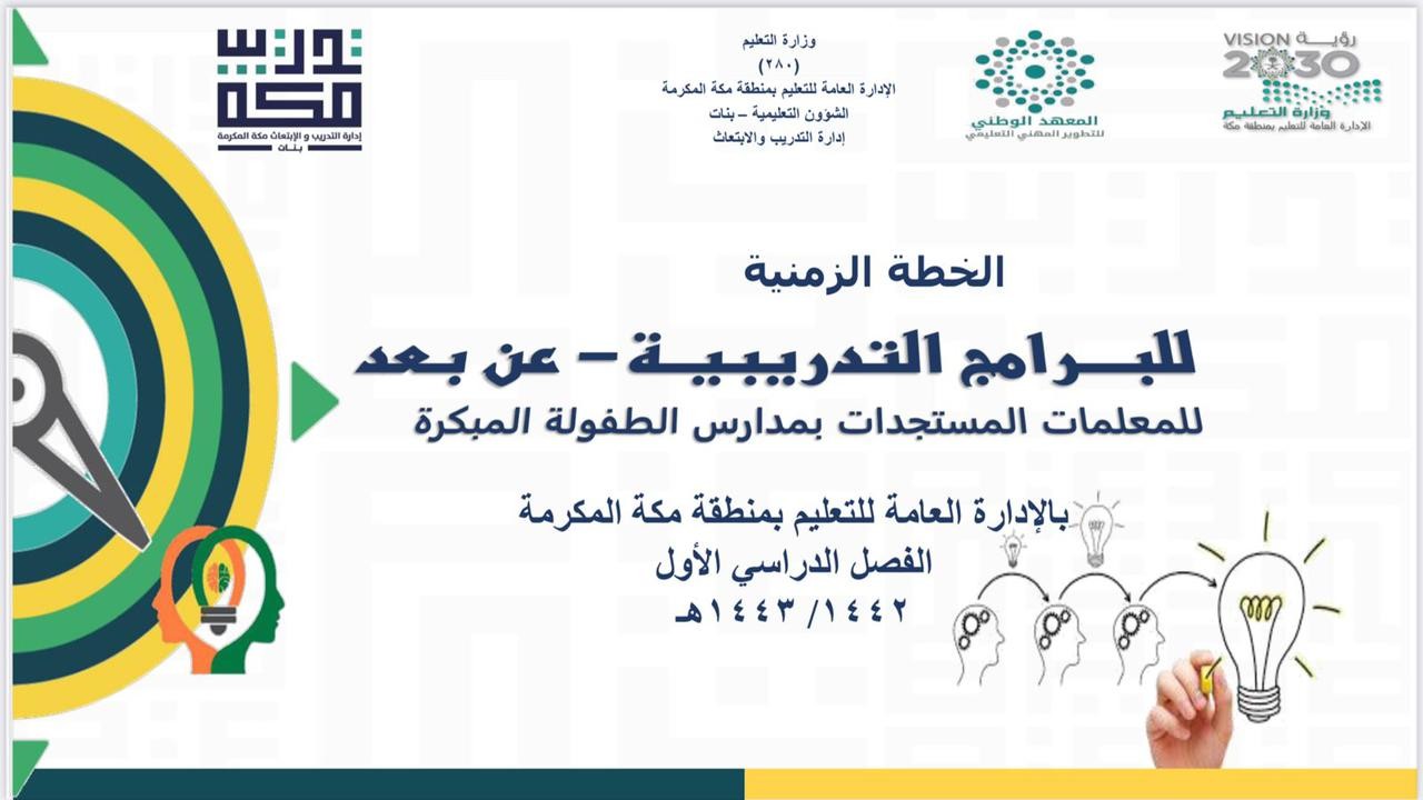 أطلقت الإدارة العامة للتعليم بمنطقة مكة المكرمة ممثلةً بإدارة التدريب والابتعاث يوم الأحد الموافق 28 / 1/ 1443هـ، خطتها التدريبية للمعلمات المستجدات في مدارس الطفولة المبكرة لعام 1443هـ وذلك بواقع 136 ساعة تطوير مهني خلال 34 يوم متواصلة، تشمل 22 برنامجا تدريبيا مهنيا تطويريا.