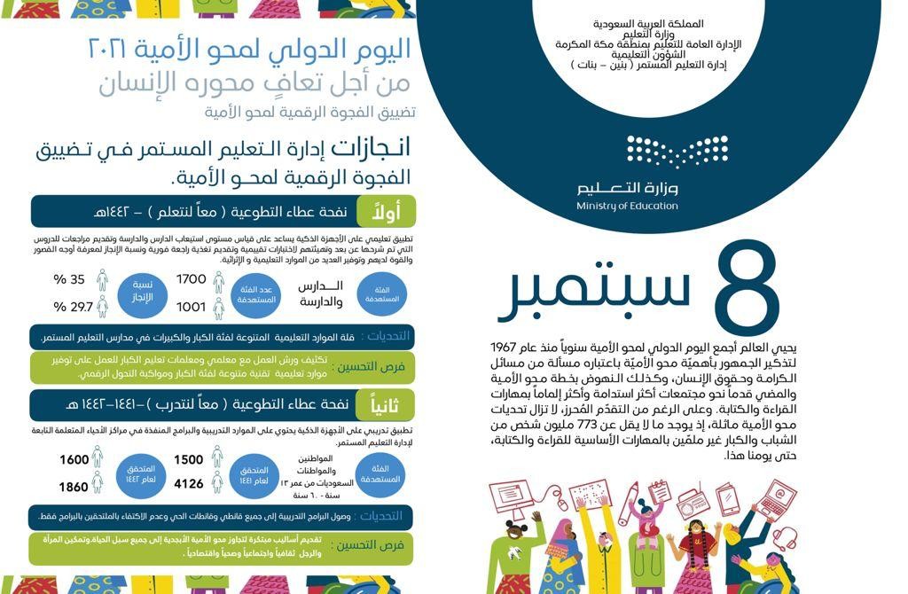 احتفت الإدارة العامة للتعليم بمنطقة مكة المكرمة ممثلة في إدارة التعليم المستمر ( بنين ـ بنات ) باليوم الدولي لمحوالأمية لعام 2021 وذلك يوم 8 سبتمبر على مستوى إدارة التعليم بمنطقة مكة المكرمة وذلك بمشاركة 105مدرسة و9 مراكز أحياء متعلمة لتساهم في تضييق الفجوة الرقمية لمحو الأمية.