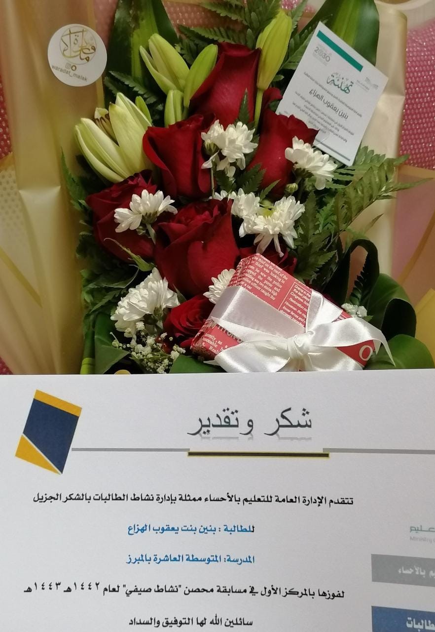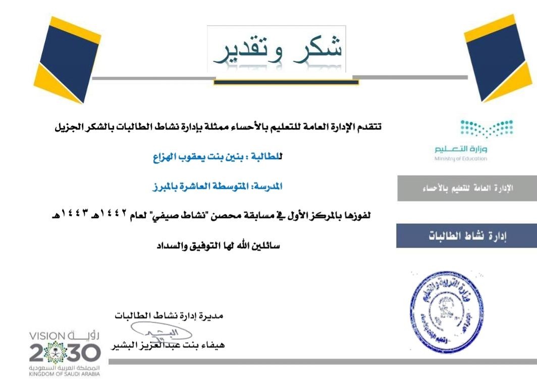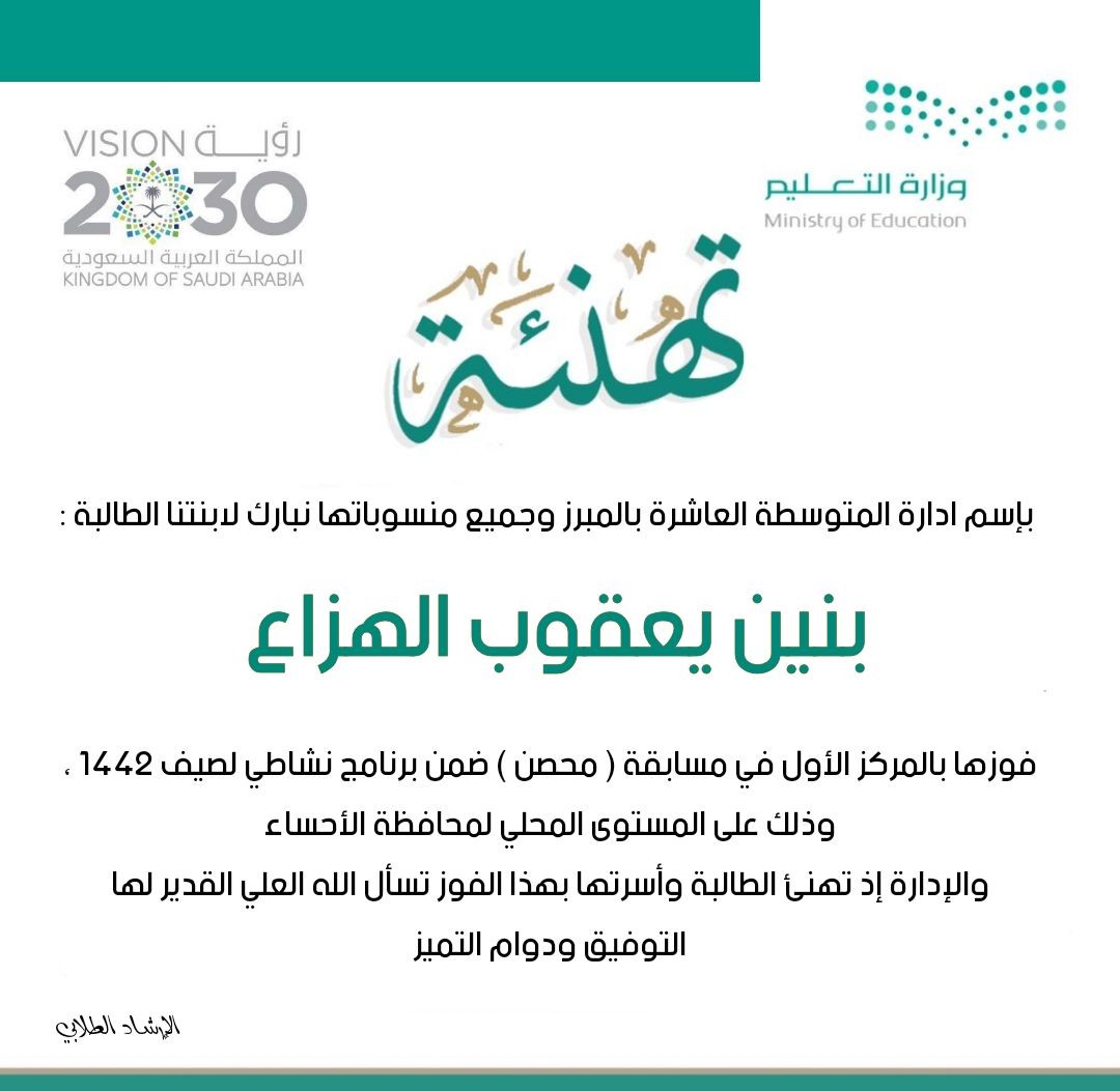 احتفت إدارة مدرسة العاشرة المتوسطة بحي المسعودي بمدينة المبرز التابعة لمحافظة الاحساء بالطالبه المميزة والمبدعة بنين بنت يعقوب الهزاع والتي تدرس بالصف الثاني متوسط بالفوز بالمركز الأول في مسابقة (محصن - ملصق علمي) وذلك ضمن برنامج النشاطي الصيفي ١٤٤٢هـ - ١٤٤٣ هجري الذي نظمته إدارة التعليم بالأحساء.
