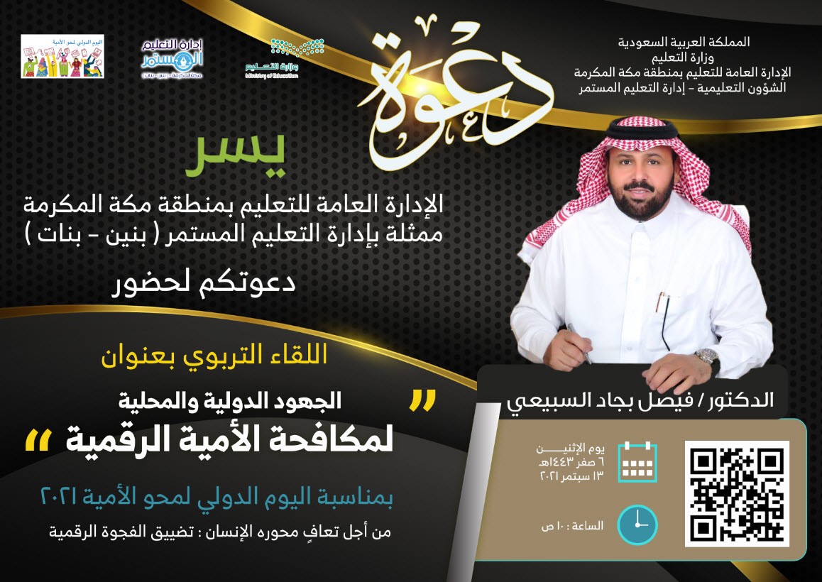 عقدت الإدارة العامة للتعليم بمنطقة مكة المكرمة، ممثلة في إدارة التعليم المستمر (بنين- بنات) بمساندة جامعة الطائف اليوم الاثنين الموافق 6 / 2 / 1443هـ، اللقاء التربوي بعنوان (الجهود الدولية والمحلية لمحو الأمية)، وذلك تفعيلا لليوم الدولي لمحو الأمية والمنعقد كل 8 سبتمبر من كل عام، عن بعد عبر القاعة الافتراضية zoom، تحت إشراف إدارة التعليم المستمر بنين – بنات، من تقديم الدكتور فيصل بن بجاد السبيعي، حيث بدأ اللقاء بكلمة مساعدة المدير العام للشؤون التعليمية لمياء بنت عبدالعزيز بشاوري، للوقوف على جهود منطقة مكة المكرمة في محو الأمية الرقمية، تلاها كلمة مدير إدارة التعليم المستمر خالد جميل الحارثي، وكلمة مديرة إدارة التعليم المستمر دلال بنت عطية اللحياني.