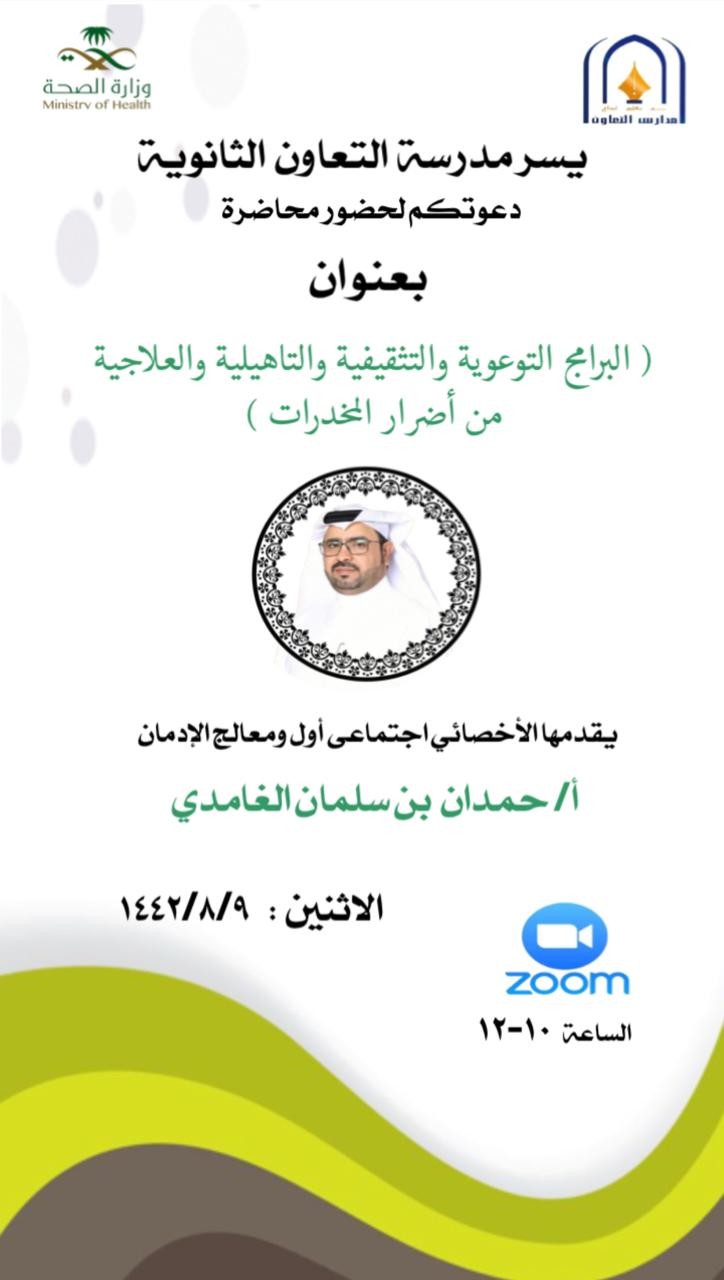 قدم مجمع إرادة والصحة النفسية لخدمات إرادة بجدة ضمن برامج التوعية الصحية لقطاع التعليم محاضرةً توعوية وبرنامجًا تثقيفيًا بعنوان (أهمية البرامج التوعوية والتثقيفية والتأهيلية والعلاجية بأضرار المخدرات) لطلاب المرحلة الثانوية بمدارس التعاون الأهلية وذلك بهدف رفع مستوى الوعي والإدراك لدى الطلاب والأسر وحيث تجاوز العدد ٤٠٠ طالب مما كان له أكبر الأثر في نفوس المعلمين والطلاب.