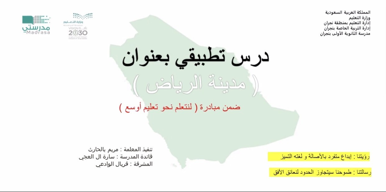فيما قدمت معلمة "العوق العقلي" بالثانوية الأولى بنجران مريم بالحارث في هذا الإطار درس تطبيقي بعنوان "مدينة الرياض وبمشاركة الثانوية ١٤٦ بمكتب الشفاء بالرياض والمعلمتين فاطمة المشاري وشريفة المشاري،  تبادل من خلاله الطالبات أهم معالم منطقتي الرياض ونجران وأهم ما يميزهم في إطار تخيلي لسفرهم إلى مدينة الرياض والتنقل في معالمها بمرافقة طالبات الثانوية ١٤٦ بالرياض كمرشدات لهن في رحلتهن.