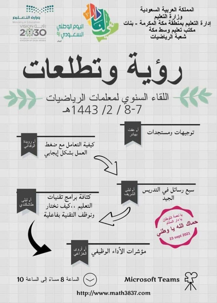 عقدت الإدارة العامة للتعليم بمنطقة مكة المكرمة ممثلة في مكتب تعليم وسط مكة اللقاء السنوي لمعلمات الرياضيات "رؤية وتطلعات" يومي الثلاثاء والأربعاء من 8 _ 9/ 2 / 1443هـ، نفذته كل من : عفت بهادر ، ليلى الشريف، رويدة الوقداني ، أروى الخزاعي ولیلی طاشكندي عبر القاعة الافتراضية من خلال برنامج (Microsoft Teams) تحت إشراف مديرة مكتب الوسط سارة الدعجاني .
