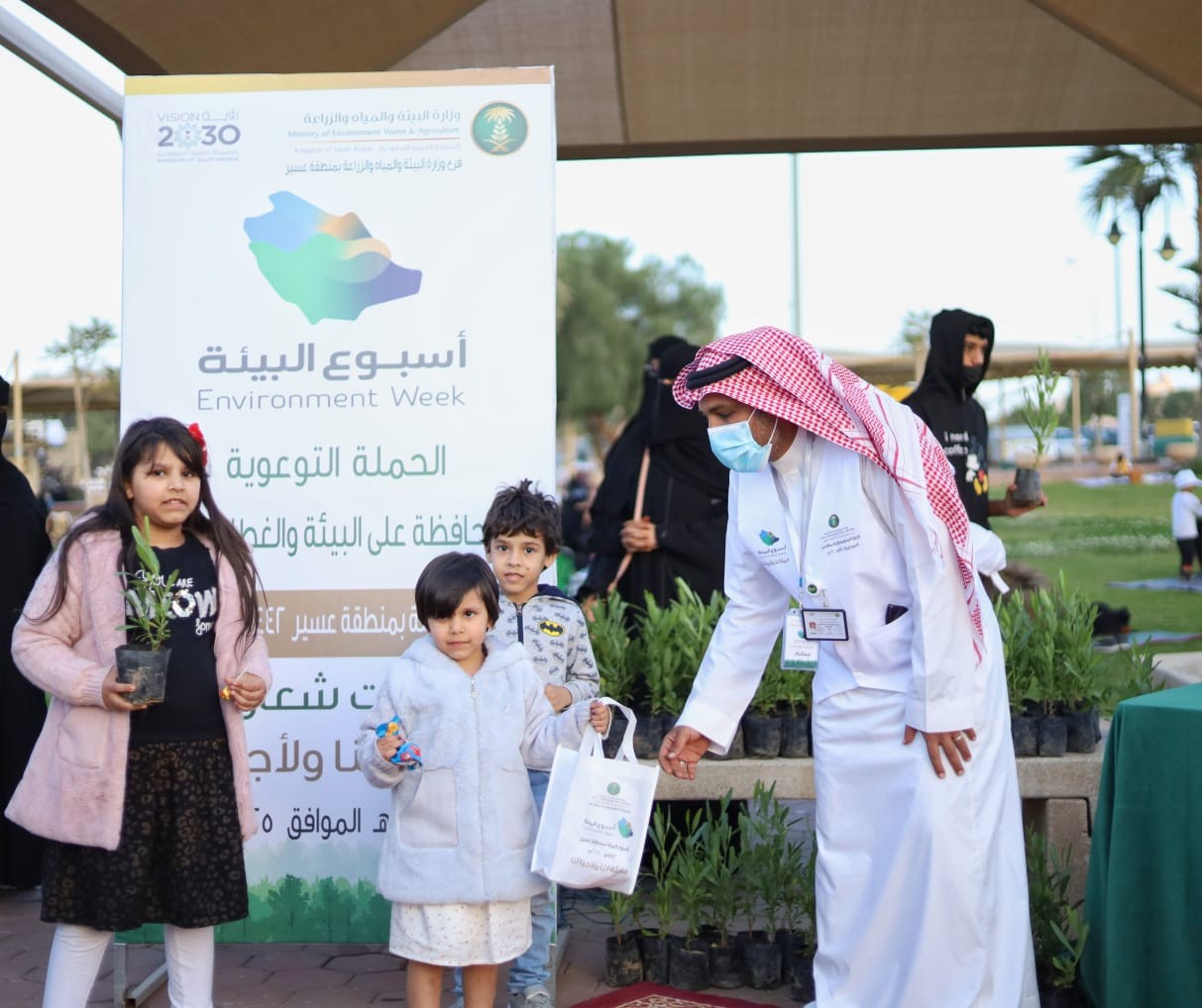 وتم تقديم شرح لما قدمه فرع وزارة البيئة والمياه والزراعة في إسبوع البيئة تحت شعار "البيئة لنا ولأجيالنا" وتم توزيع الهدايا والشتلات على الحضور، وأيضاً أكياس لتنظيف الحديقة بمشاركة أمانة منطقة عسير وعدد من الفرق التطوعية.
