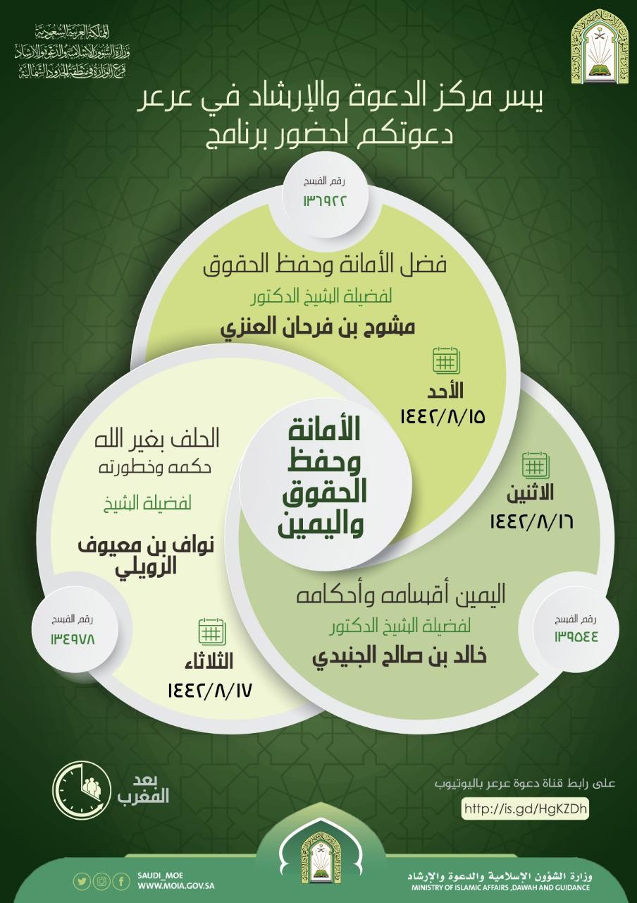 ينفذ فرع وزارة الشؤون الإسلامية والدعوة والإرشاد في منطقة الحدود الشمالية البرنامج الدعوي الأمانة وحفظ الحقوق واليمين