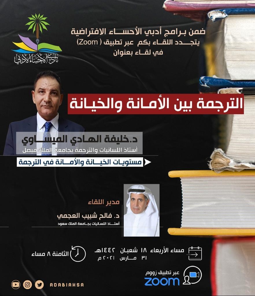 ينظم نادي الأحساء الأدبي محاضرة افتراضية عبر تطبيق (Zoom) عند الساعة الثامنة من مساء يوم الأربعاء القادم، يتحدث فيها أستاذ اللسانيات والترجمة بجامعة الملك فيصل خليفة الهادي الميساوي، ويديرها أستاذ اللسانيات بجامعة الملك سعود فالح شبيب العجمي، وسيكون رابط المحاضرة متاحا على تطبيق النادي وحساباته على منظومة الهواتف الذكية