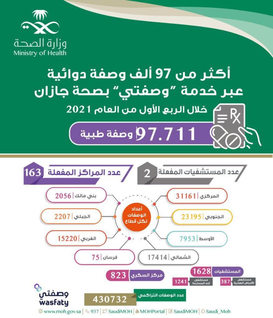 اكثر من 97 الف وصفة دوائية عبر خدمة وصفتي بصحة جازان خلال الربع الأول لعام 2021