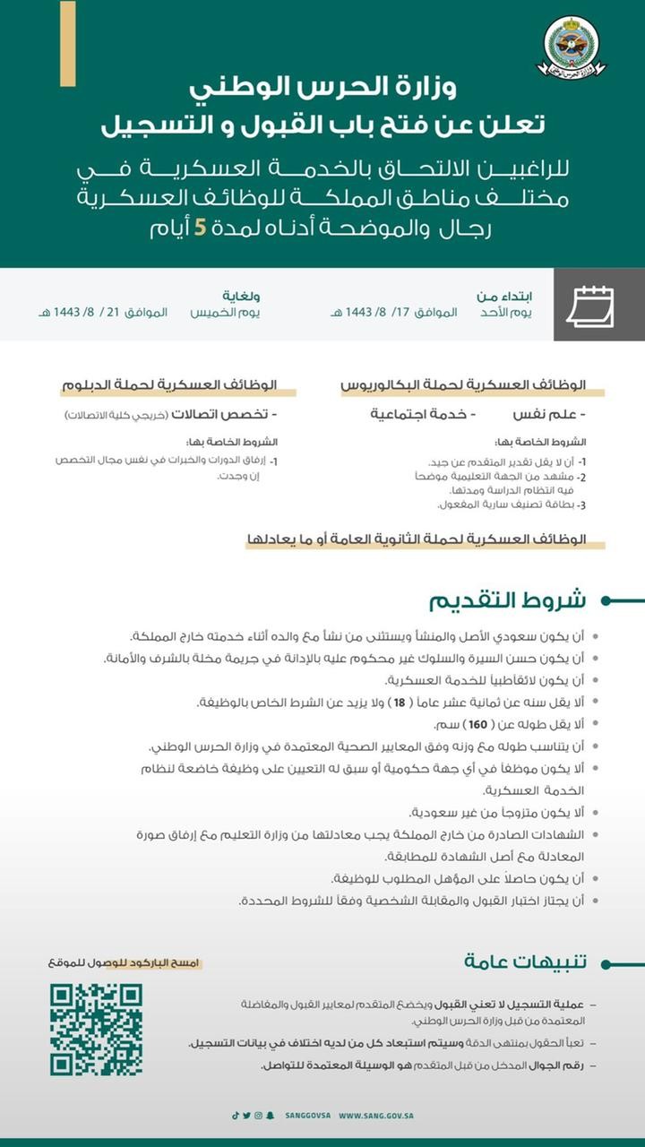 أعلنت وزارة الحرس الوطني عن فتح باب القبول والتسجيل للراغبين في الالتحاق بالخدمة العسكرية بمختلف (مناطق المملكة) للوظائف العسكرية (رجال)، لحملة (الثانوية) أو (الدبلوم) أو (البكالوريوس)، وذلك وفقاً للتفاصيل الموضحة أدناه.