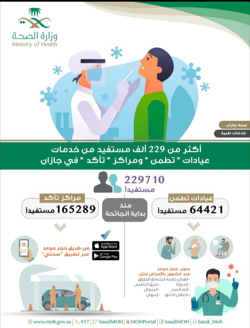 وبينت صحة جازان أن عدد المستفيدين من خدمات عيادة “تطمن” بلغ 64421 مستفيداً، فيما بلغت عدد المسحات التي تم إجراؤها في مراكز “تأكد” 165289 مسحةً من خلال عدة مواقع، منها محطة الفحص الموسع عن طريق السيارات.