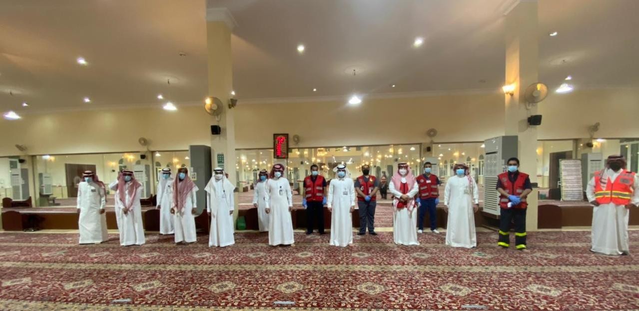 وشارك مراقبي المساجد ومنسوبو الهلال الأحمر بتنظيم دخول المصلين ومتابعة التزامهم بالإجراءات الإحترازية و إجراء فحص الحرارة لهم عند الدخول .