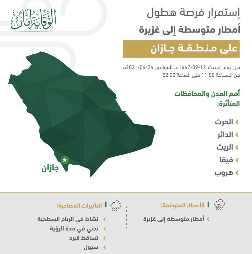 نبّه المركز الوطني للأرصاد من أمطار رعدية على المرتفعات الجبلية بمنطقة جازان اليوم، تشمل تأثيراتها نشاطًا في الرياح السطحية وضعفًا في مدى الرؤية على محافظات الحرث، والداير، وفيفا، وهروب، والريث.