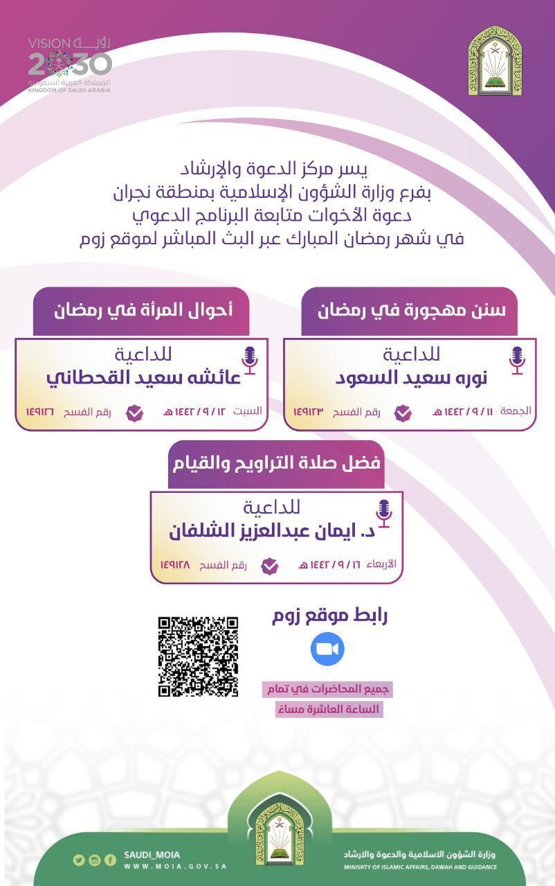 حيث ألقت الداعية نورة سعيد السعود يوم الجمعة الموافق 11-9-1442هـ محاضرة بعنوان "سنن مهجورة في رمضان"، كما قدمت الداعية عائشة سعيد القحطاني يوم السبت الموافق 12-9-1442هـ محاضرة بعنوان "أحوال المرأة في رمضان" بالإضافة لمحاضرة بعنوان "فضل صلاة التراويح والقيام" ستقدم يوم الأربعاء الموافق 16-9-1442هـ للداعية الدكتورة إيمان عبدالعزيز الشلفان .
