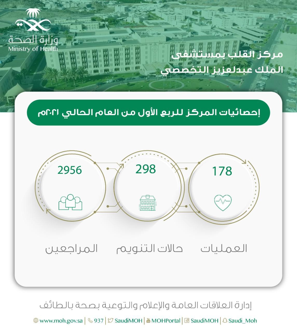 قدم مركز القلب بمستشفى الملك عبدالعزيز التخصصي بالطائف خدماته لـ 3254مستفيد خلال الربع الأول من العام الحالي 2021، حيث تضمنت حالات إنقاذ الحياة، وحالات طارئة، وحالات منومة بأقسام التنويم؛ و بلغ عدد حالات القسطرة القلبية 178 عملية كما بلغ عدد الحالات المنومة 298 فيما بلغ عدد المستفيدين من العيادات 2956 مستفيد.