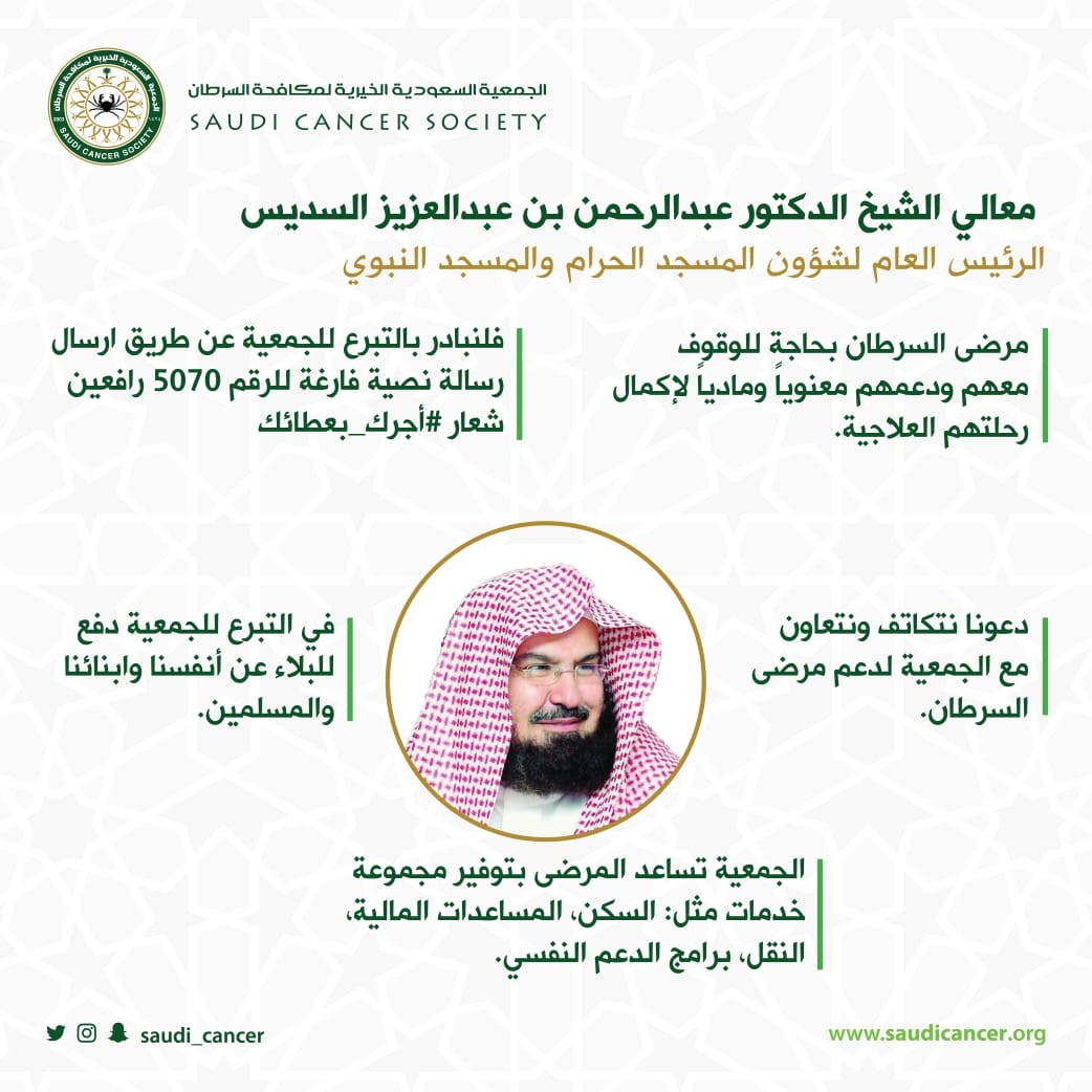 اكد الرئيس العام لشؤون المسجد الحرام والمسجد النبوي الشيخ الدكتور عبدالرحمن السديس على ضرورة بذل الطاعات والعبادات وحث على التبرع والانفاق في أوجه الخير وأهمية التكاتف والتعاون لدعم مرضى السرطان والوقوف معهم والدعاء لهم ودعمهم ماديًا ومعنويًا لإكمال رحلة علاجهم.