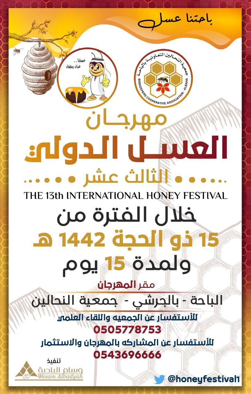 تحتضن منطقة الباحة خلال صيف هذا العام 1442هـ مهرجان العسل الدولي الثالث عشر والفعاليات المصاحبة، التي تٌفتتح بالتزامن مع افتتاح مباني ومشاريع جمعية النحالين التعاونية بالباحة، وذلك برعاية كريمة من صاحب السمو الملكي الأميرالدكتور حسام بن سعود بن عبدالعزيز أمير منطقة الباحة، ومتابعة وتوجيهات سعادة وكيل الإمارة الأستاذ عبدالمنعم الشهري، في الفترة من 15-29 ذي الحجة 1442ه، بمقر الجمعية ببلجرشي، بتنظيم من جمعية النحالين التعاونية بالباحة وتنفيذ مؤسسة وسام البادية.