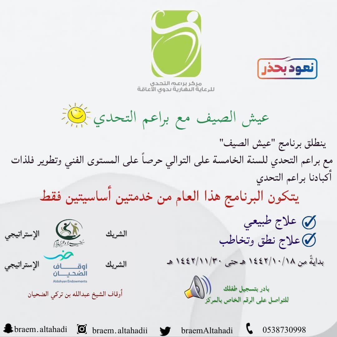 دشن مركز براعم التحدي للرعاية النهارية بالجوف الرابط الإلكتروني الخاص بالتسجيل في برنامج عيش الصيف مع براعم التحدي للسنة الخامسة على التوالي برعاية كريمة من أوقاف الشيخ عبدالله بن تركي الضحيان ومشاركة استراتيجية من جمعية سفراء السلام لخدمات الأشخاص ذوي الإعاقة