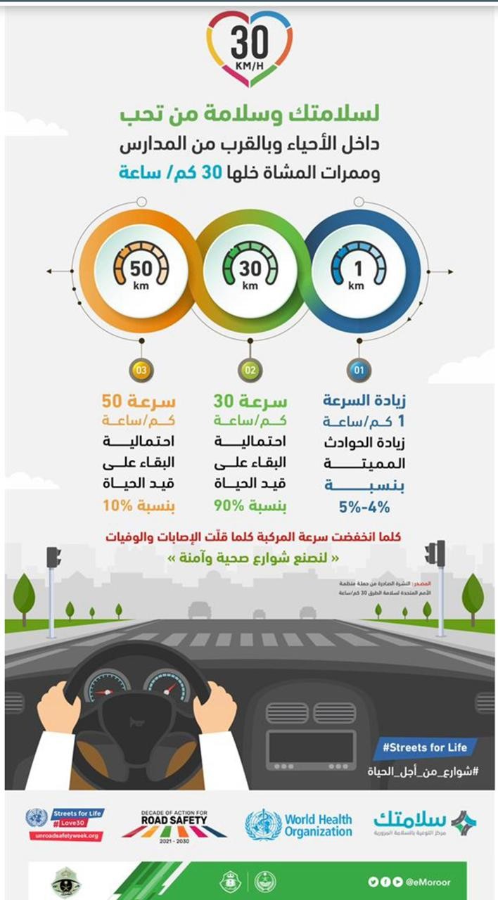 ولفت إلى أن نسبة النجاة لمستخدمي الطرق عند سرعة 30 كم/ساعة هي 90%، ونسبة النجاة عند سرعة 50 كم/ساعة هي 10%، مبيناً أن زيادة السرعة 1 كم /ساعة تزيد الحـوادث المميتة بنسبة 4 إلى 5%.