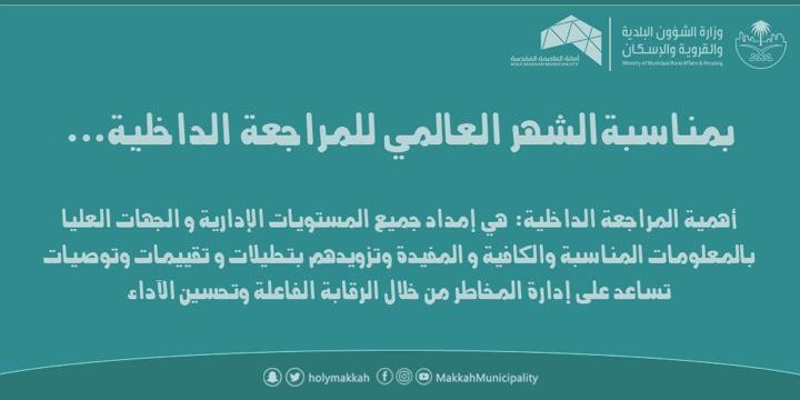 شاركت أمانة العاصمة المقدسة بأنشطة المراجعة الداخلية عبر الرسائل التوعوية، تزامناً مع الشهر العالمي للمراجعة الداخلية؛ وذلك لنشر ثقافة المراجعة الداخلية ورفع مستوى الوعي المعرفي والوظيفي وتحقيق أعلى معايير الجودة والإنتاجية الوظيفية.