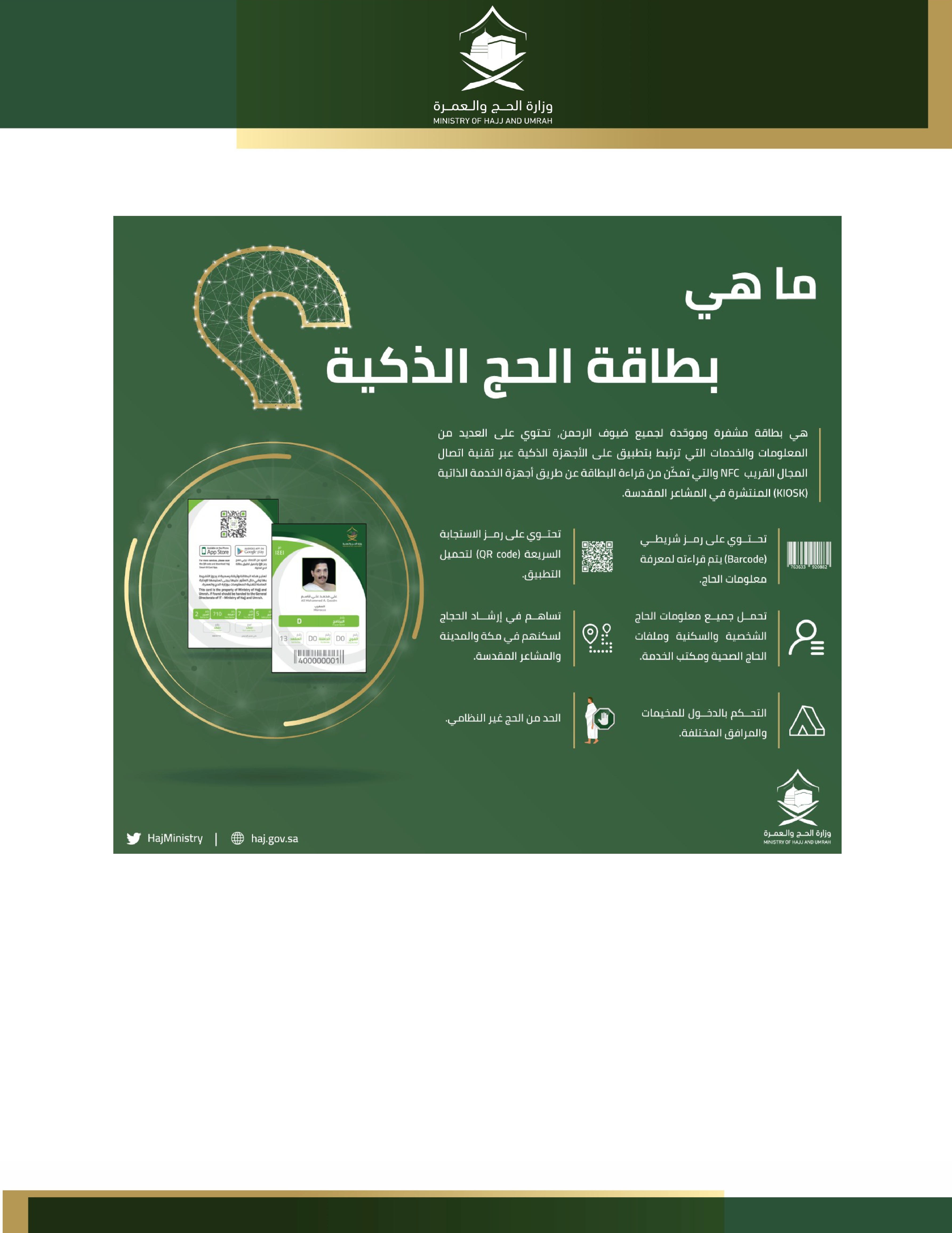 من جانبه أوضح معالي نائب وزير الحج والعمرة الدكتور عبدالفتاح مشاط أن البطاقة الذكية تحتوي على معلومات الحاج الشخصية والطبية والسكنية وهي مرتبطة بكافة الخدمات التي يمكن تقديمها للحاج مثل دخول المخيمات واستخدام وسائل النقل والدخول للفنادق واستخدام البطاقة في عمليات الدفع عبر نقاط البيع وأجهزة الصراف، كما تسهم البطاقة في إرشاد الحجاج التائهين، والتحكم بالدخول للمخيمات وتوقيت الحشود، والمرافق المختلفة.