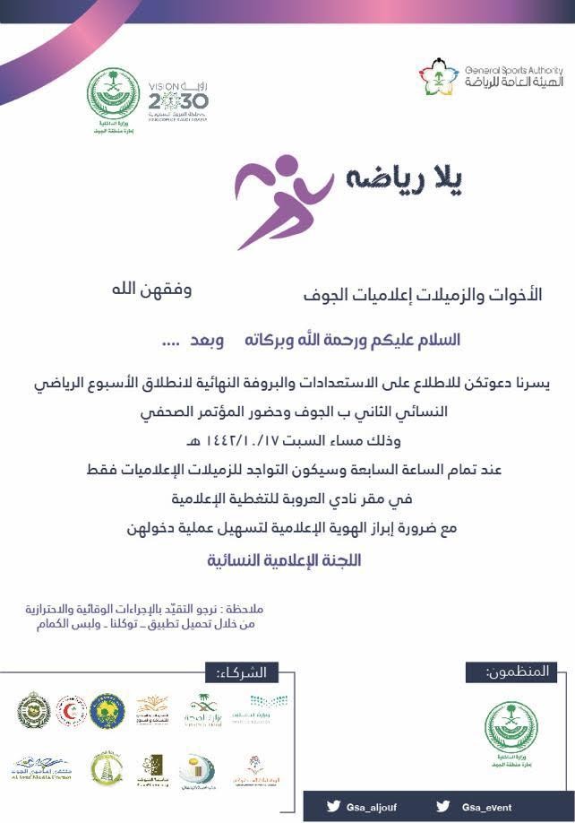 النسائي الثاني تحت شعار " يلّا رياضه " التي ستقام على منشاة نادي العروبة للرياضة بالجوف خلال الفترة من 19 إلى 22 شوال الجاري ، وذلك بالتعاون مع الهيئة العامة للرياضة وبإشراف ومتابعة مكتب وزارة الرياضة بالجوف ، مؤتمراً صحفياً مساء يوم السبت المقبل 17/ 10. في قاعة المؤتمرات بنادي العروبة في تمام الساعة السابعة مساءً