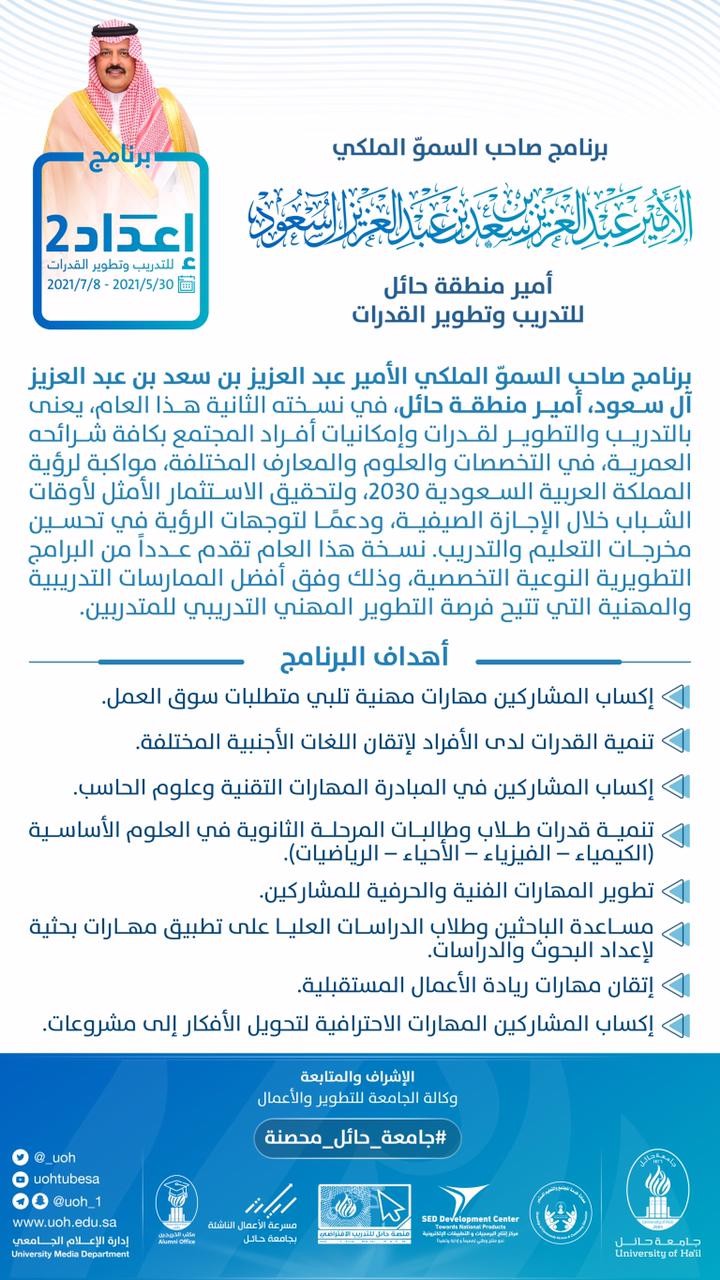 أطلقت جامعة حائل اليوم سلسلة من البرامج التدريبية في النسخة الثانية من برنامج صاحب السموّ الملكي الأمير عبد العزيز بن سعد بن عبد العزيز، أمير منطقة حائل، للتدريب وتطوير القدرات "إعداد2" الذي تُنفذ برامجه التدريبية خلال صيف هذا العام 2021م في ستة مسارات رئيسة تشتمل على :
