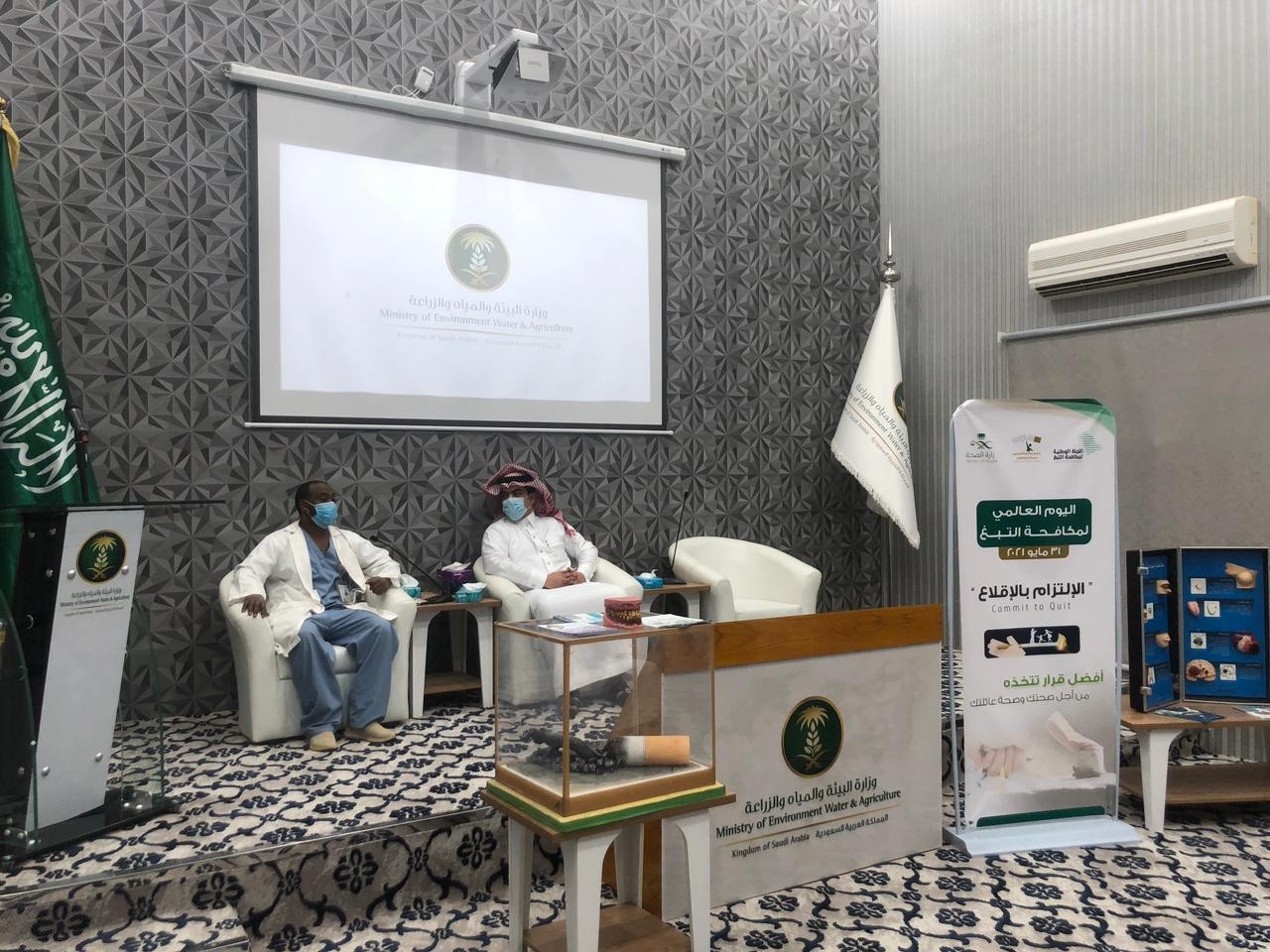 عقد مكتب وزارة البيئة والمياه والزراعة بمحافظة حفرالباطن  وبالتعاون مع مكافحة التدخين بصحة حفرالباطن محاضرة بعنوان " الصحة العالمية تحتفل باليوم العالمى للإمتناع عن التدخين 2021 " وذلك صباح اليوم الأربعاء ٢١/ ١٠ / ١٤٤٢هـ  م في مقر المكتب بالمحافظة بحضور عدد كبير من الموظفين وذلك بهدف التوعية عن أضرار التدخين  والتوضيح بأنه أحد الأسباب المؤدية للوفاة ، حيث سجلت الإحصائية  وفاة 6 ملايين شخص سنوياً ويُتوقع زيادة هذا العدد إلى أكثر من 8 ملايين شخص سنوياً بحلول عام 2030م ، بالإضافة إلى أنه عامل من عوامل الخطورة التي تؤدي إلى العديد من الأمراض .