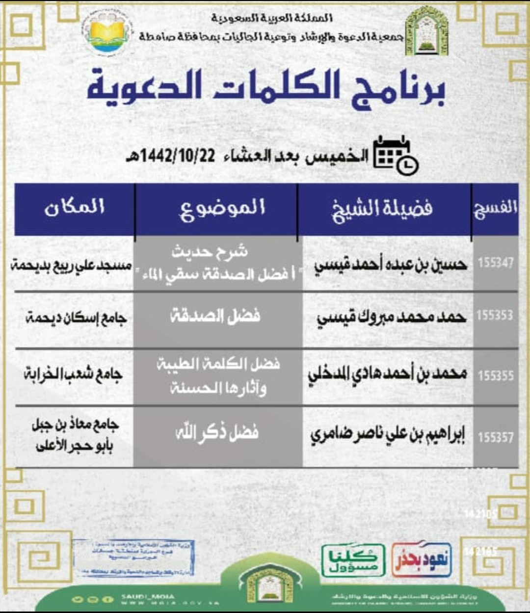 يقيم فرع وزارة الشؤون الإسلامية والدعوة والإرشاد في منطقة جازان بالتعاون مع جمعية الدعوة والإرشاد وتوعية الجاليات بمحافظة صامطة مساء الخميس الثاني والعشرون من شهر شوال 1442هجرية برنامج الكلمات الدعوية في عدد من مساجد وجوامع المحافظة يقدمها عدد من دعاة الفرع والمشايخ وطلاب العلم ويبينون خلالها فضل الصدقة وسقي الماء والكلمة الطيبة وفضل ذكر الله عز وجل .