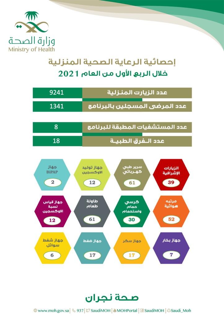 نفذت صحة نجران 9241 ألف زيارة منزلية للمرضى المسجلين في برنامج الطب المنزلي وذلك خلال الربع الأول من العام الجاري 2021م ، فيما بلغ عدد الزيارات الاشرافية لأقسام الطب المنزلي للمستشفيات المطبقة للبرنامج 39 زيارة .