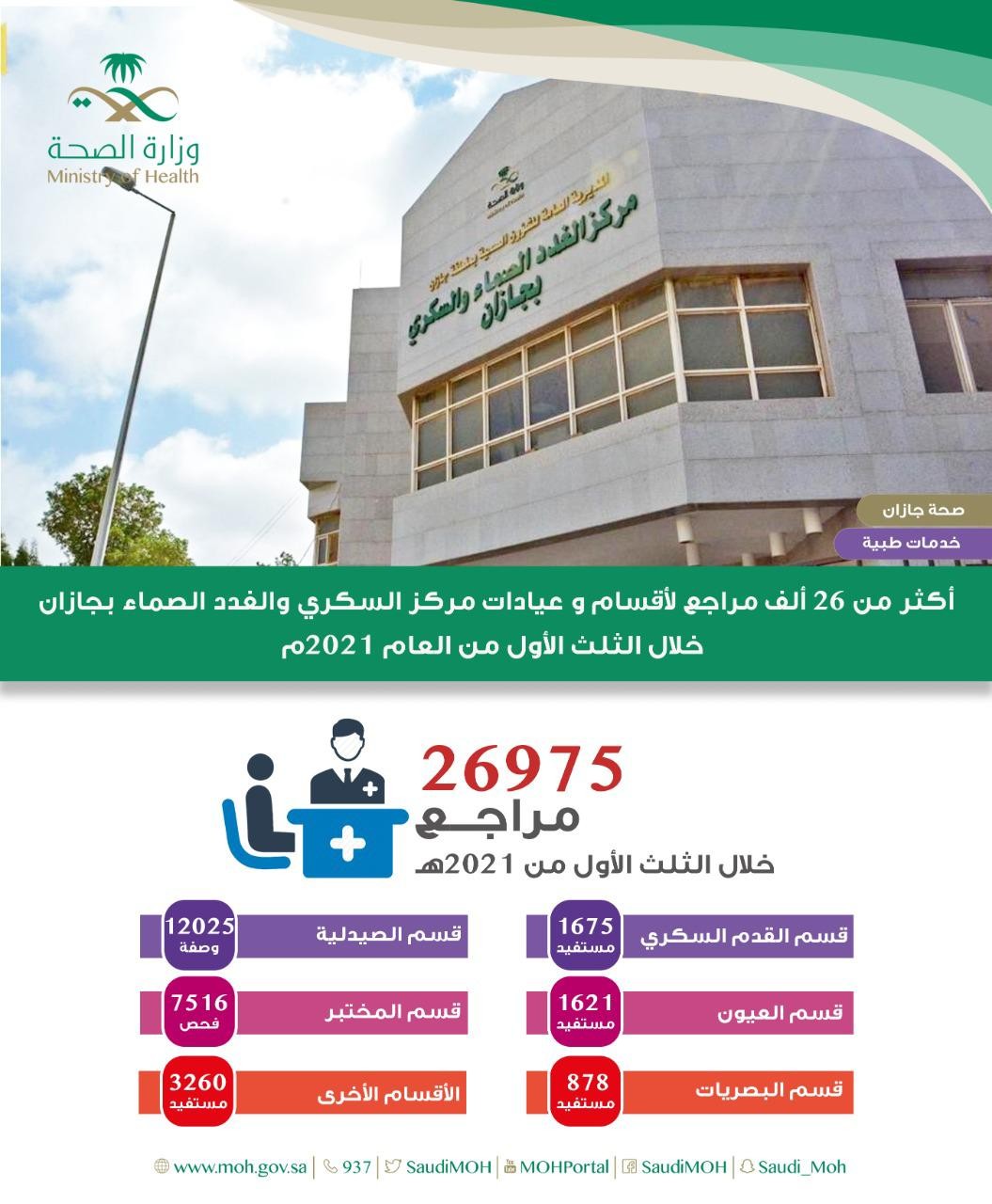 قدّمت أقسام وعيادات مركز السكري والغدد الصماء بجازان خدماتها لعدد 26975 مستفيداً، وذلك خلال الثلث الأول من العام 2021م.