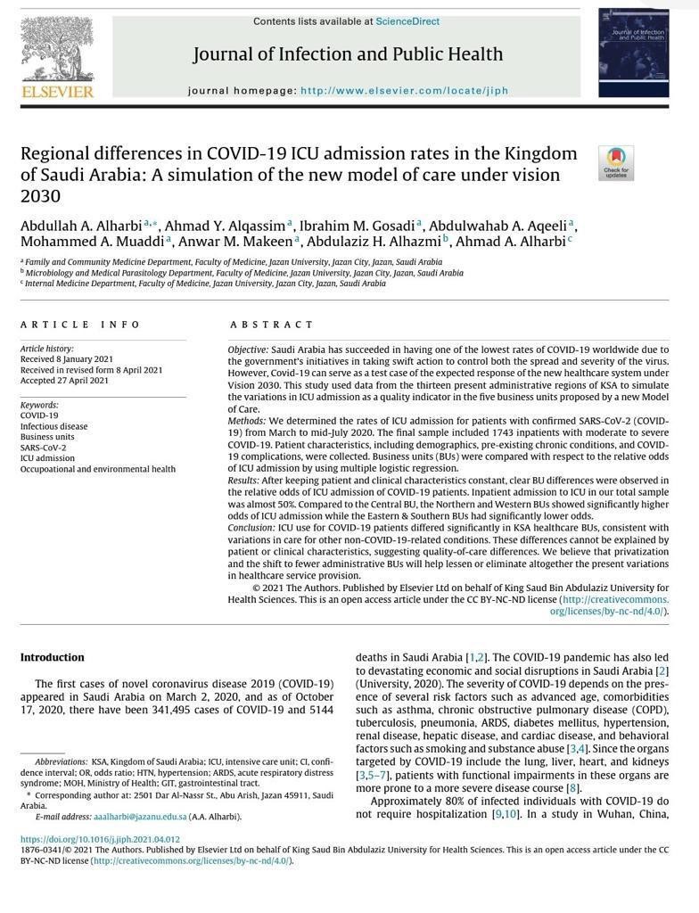 حظيت مشاركة بحثية من كلية الطب بجامعة جازان بالنشر في مجلة العدوى والصحة العامة المصنفة عالميًا، والتي تُحاكي جودة الرعاية الصحية المقدمة لمرضى كورونا قياسًا على الخطة المستقبلية لنظام الرعاية الصحية في المملكة وفقًا لرؤية ٢٠٣٠، وتمكن الفريق البحثي من التوصل إلى نتائج يمكن الاستفادة منها قبل البدء في الخصخصة ومعرفة مواطن الضعف والقوة في النظام الصحي السعودي المستقبلي، والتي يمكن العمل عليها مبكرًا كقاعدة بيانات تعتمد عليها وزارة الصحة.