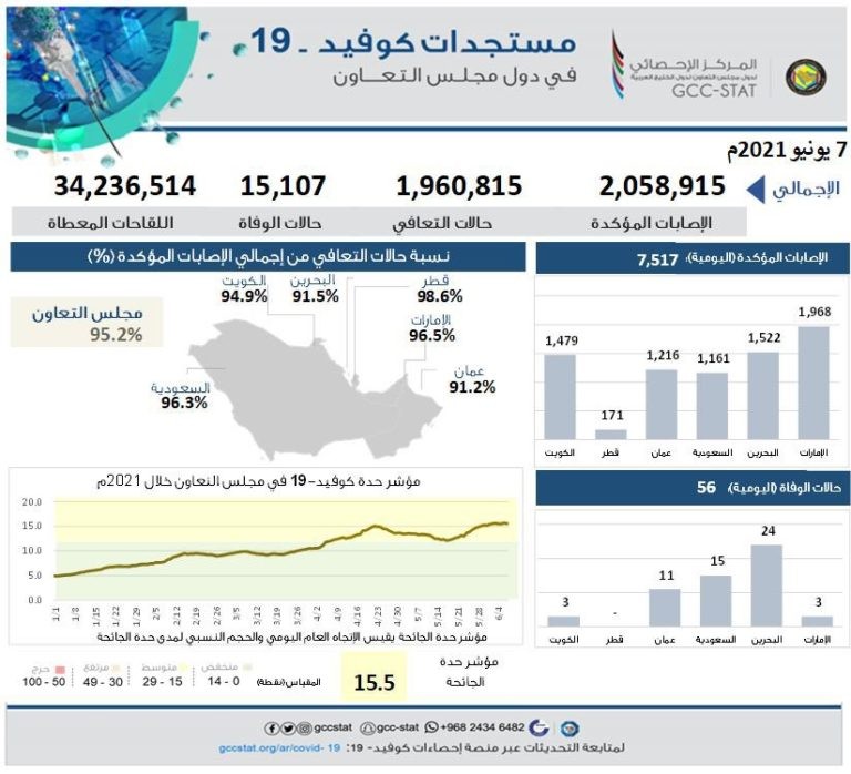 وذكر مركز الإحصاء الخليجي –عبر تويتر- أنه وفقا لإحصائيات فيروس كورونا الإجمالية في دول مجلس التعاون لدول الخليج العربية، حتى أمس الاثنين، فقد بلغ إجمالي الإصابات المؤكدة (2,058,915)، وإجمالي حالات التعافي (1,960,815)، وإجمالي حالات الوفاة (15,107). بينما بلغ عدد جرعات لقاح كورونا (34,236,514) جرعة.