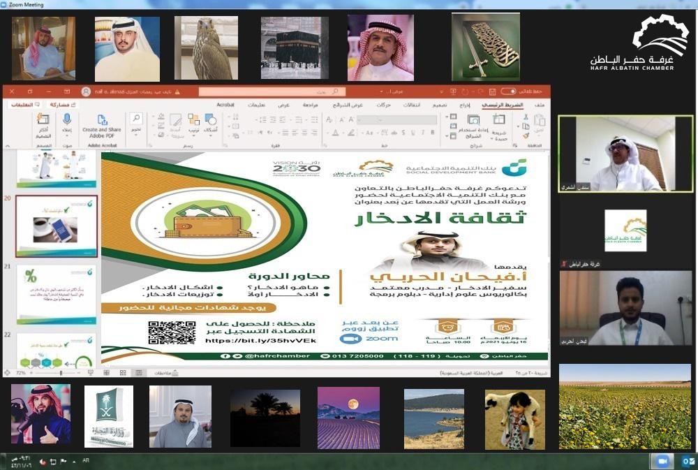 نظمت غرفة حفرالباطن، بالتعاون مع فرع بنك التنمية الاجتماعية بالمحافظة اليوم، دورة تدريبية افتراضية عبر برنامج zoom بعنوان "مهارات الادخار الشخصي" بمشاركة أكثر من 40 متدرب ومتدربة قدمها سفير الادخار المدرب المعتمد فيحان الحربي.