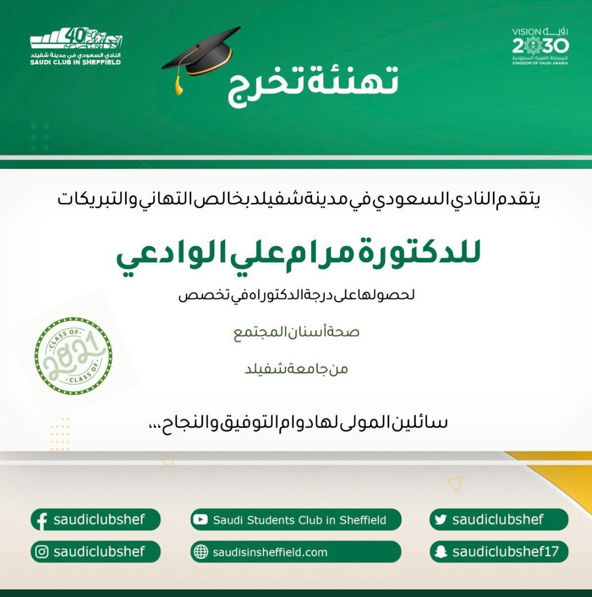 حصلت الدكتورة "مرام علي السحامي الوادعي" على درجة "الدكتوراه" من جامعة شفيلد بالمملكة المتحدة في تخصص "صحة أسنان المجتمع" بتقدير ممتاز مع مرتبة الشرف الأولى.