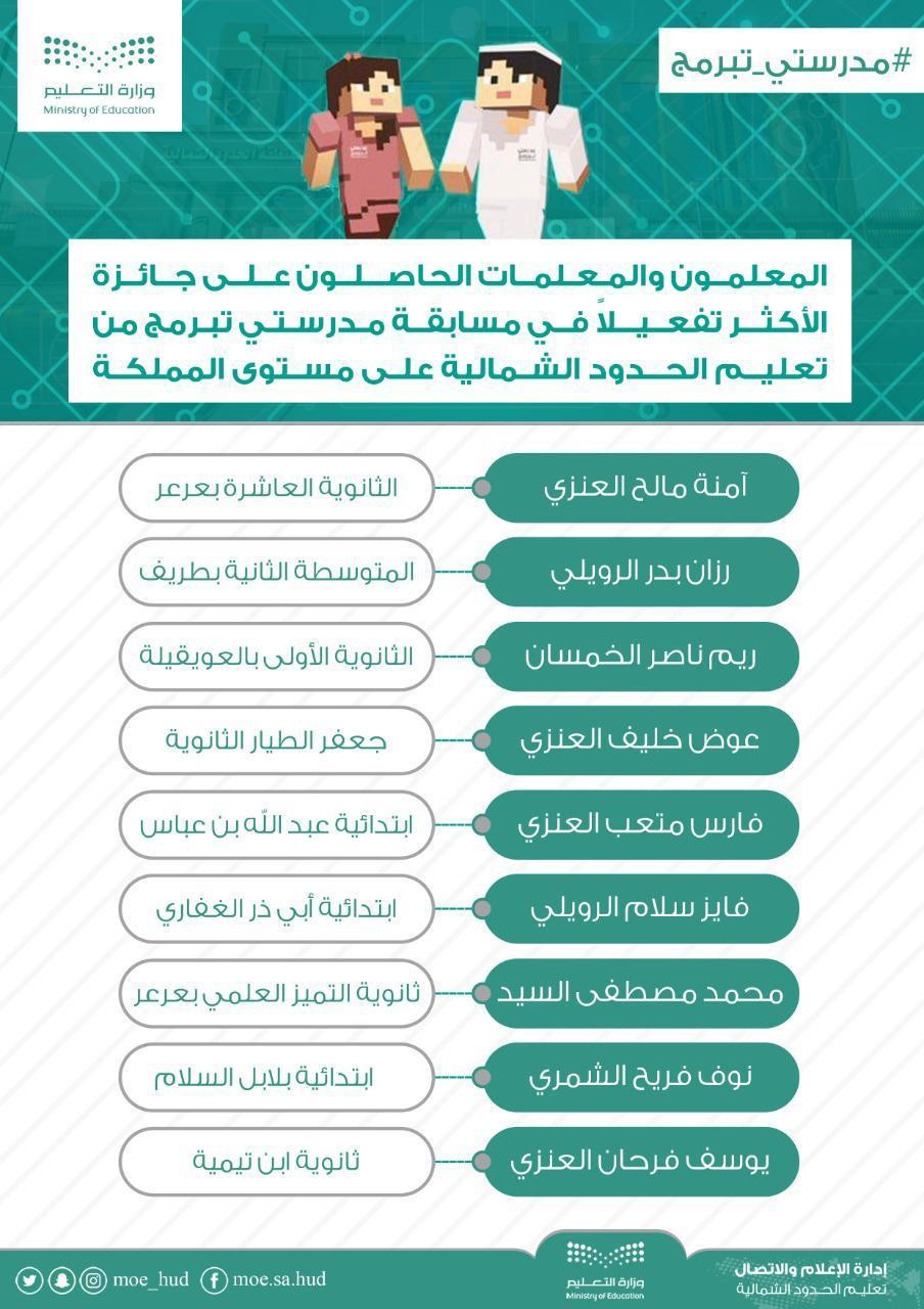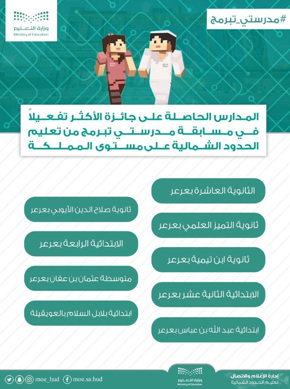 حققت الإدارة العامة للتعليم في منطقة الحدود الشمالية, 19 جائزة في مسابقة مدرستي تبرمج على مستوى وزارة التعليم في فئاتها الثلاث إدارات التعليم – المدارس – المعلمين والمعلمات.