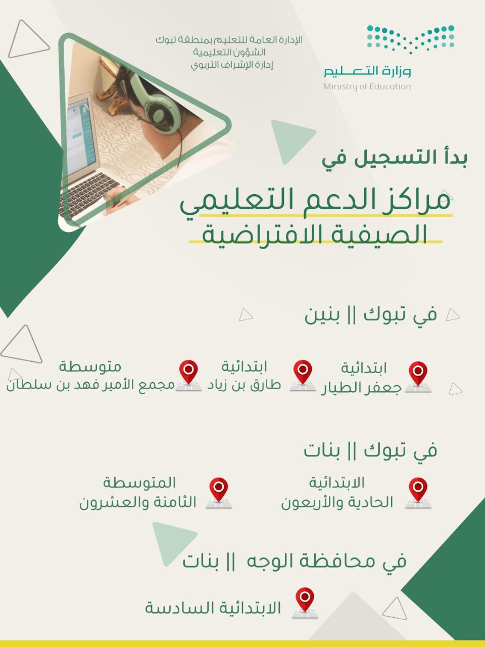 اعتمدت الإدارة العامة للتعليم بمنطقة تبوك، افتتاح ستة مراكز للدعم التعليمي الصيفي "عن بُعد" عبر منصة "مدرستي"، للطلاب في ابتدائية طارق بن زياد، جعفر الطيار، مجمع الأمير فهد بن سلطان وللطالبات في الابتدائية الحادية والأربعون،