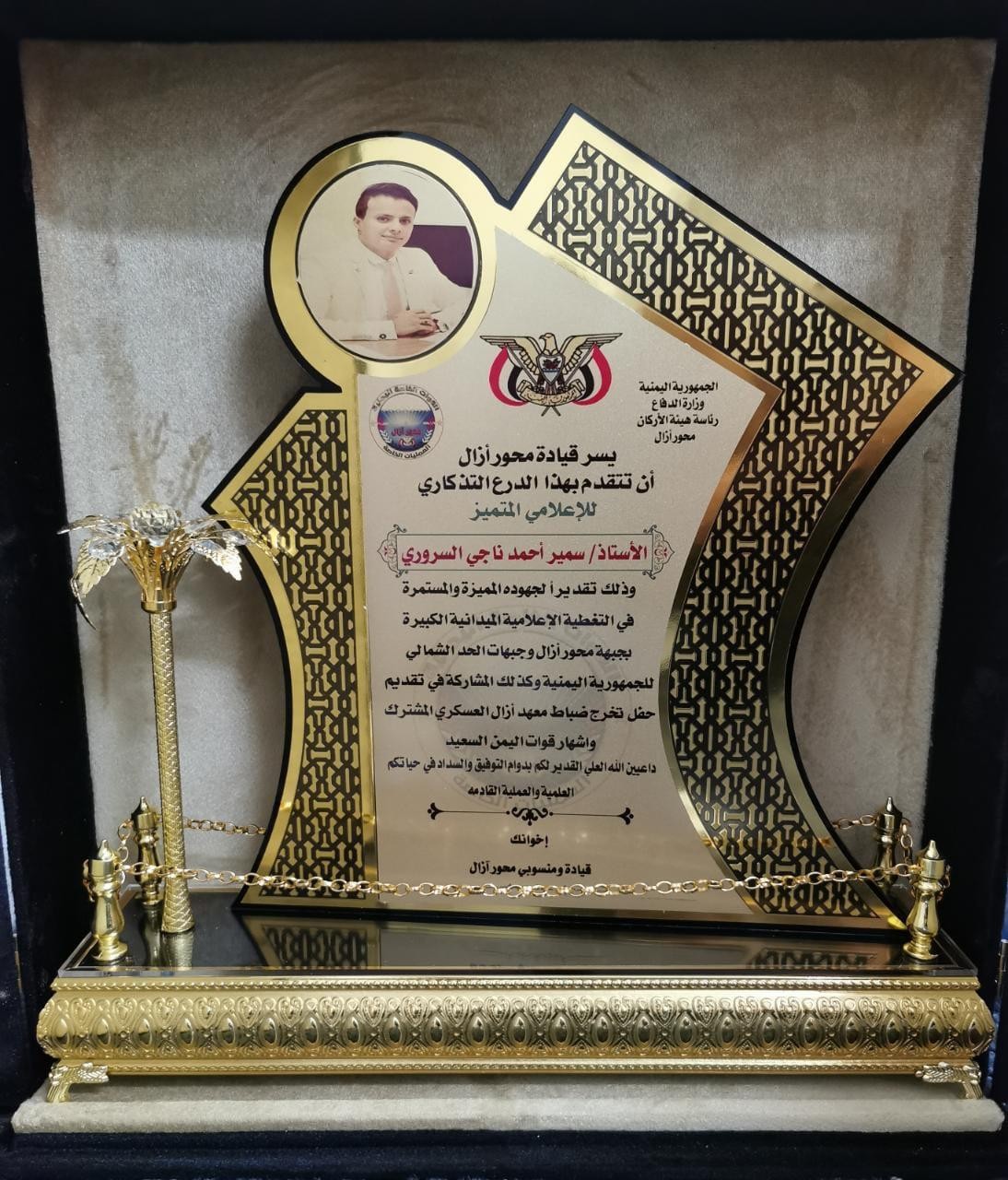 نظير جهوده الإعلامية المتميزة وكذلك لمشاركته الفاعلة في تدريب ضباط معهد أزال العسكري المشترك في الدورة التخصصية المهارات الإعلامية وتقنية الإتصال الفعال.