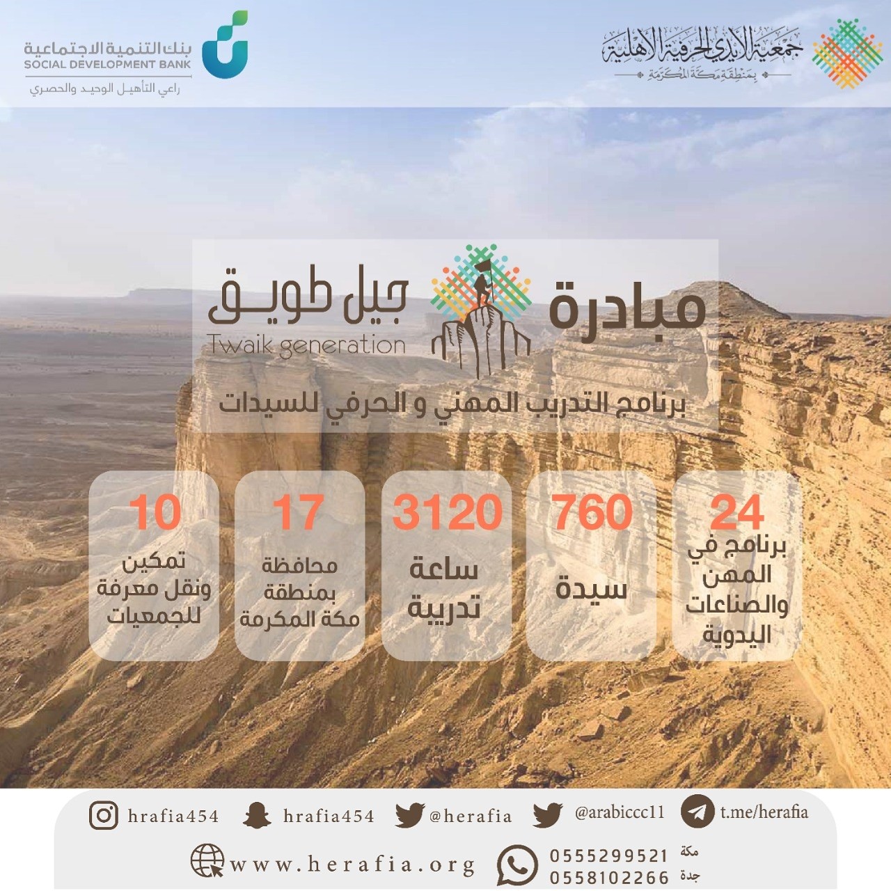 أطلقت جمعية الأيدي الحرفية الأهلية بمنطقة مكة المكرمة وبدعم من بنك التنمية الاجتماعية ، الراعي الوحيد والحصري ، مبادرة جيل طويق تحت شعار  (همة وطموح يعانق السماء ) لتدريب وتأهيل 760  سيدة  في 17 محافظة بمنطقة مكة المكرمة بواقع 3120 ساعة تدريبية في المهن والصناعات اليدوية.