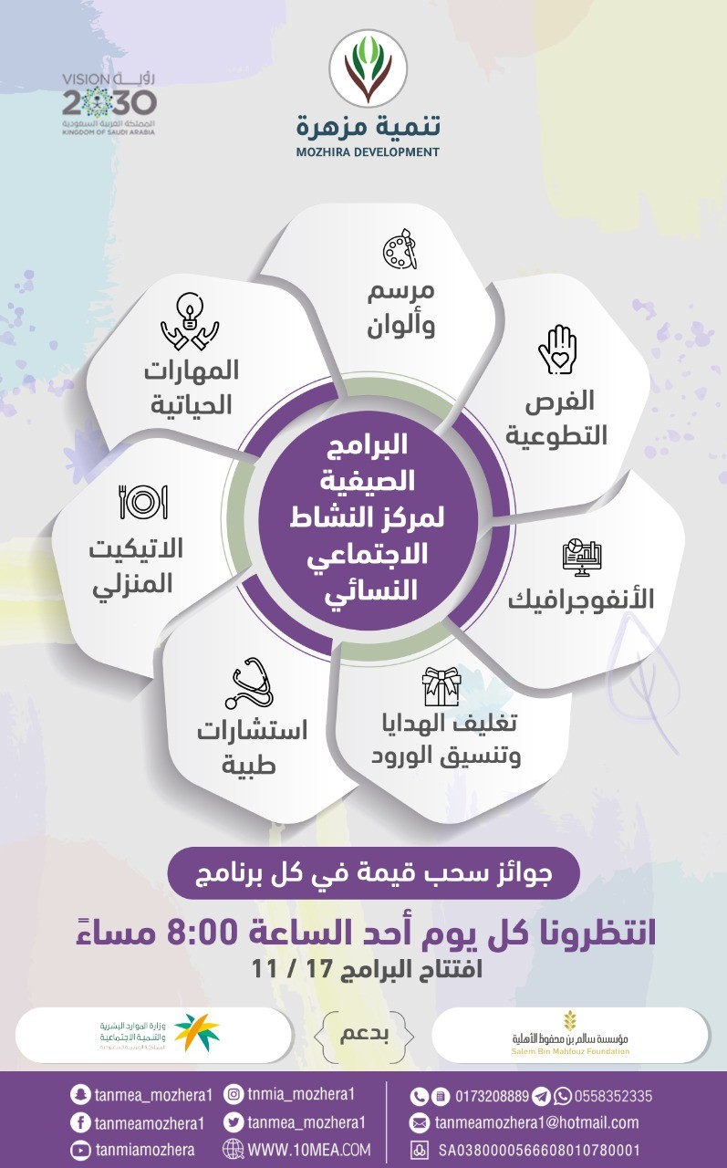 قام مركز النشاط الاجتماعي بمزهرة بتدشين البرامج الصيفية لمركز النشاط الاجتماعي النسائي وسوف تكون البرامج على النحو التالي برنامج الفرص التطوعية و برنامج مرسم وألوان وبرنامج المهارات الحياتية وبرنامج الاتيكيت المنزلي وبرنامج الأنفوجرافيك وبرنامج تغليف الهدايا وتنسيق الورود وبرنامج الاستشارات الطبية الجدير بالذكر أن هذه البرامج مهمة جدا لتطوير مهارات المتدربات وصقل مواهبهن وتمكينهن من الحصول على فرص عمل ويتخلل هذه البرامج سحب على جوائز قيمة لكل برنامج من البرامج المطروحة .